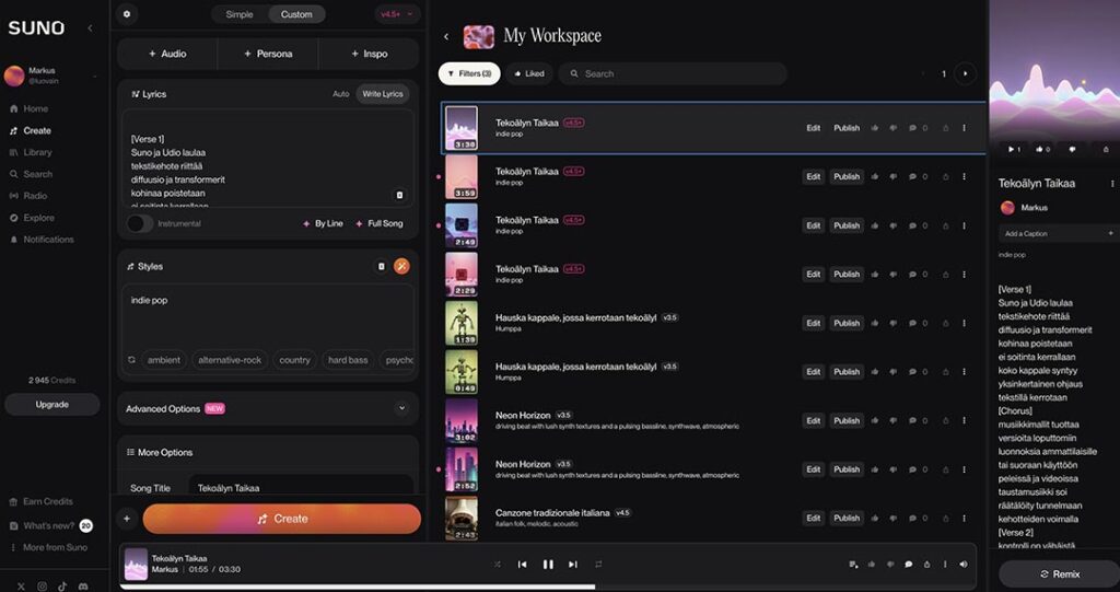 Kappaleen tekeminen tapahtuu kuvailemalla tyylilajia. Kappaleisiin on mahdollista kirjoittaa myös sanat. Lausuminen jopa suomeksi onnistuu yllättävän hyvin palveluissa käytetyiltä malleilta, joskin välillä läpi kuuluu koulutusaineiston vahva painotus englanninkieliseen musiikkiin.