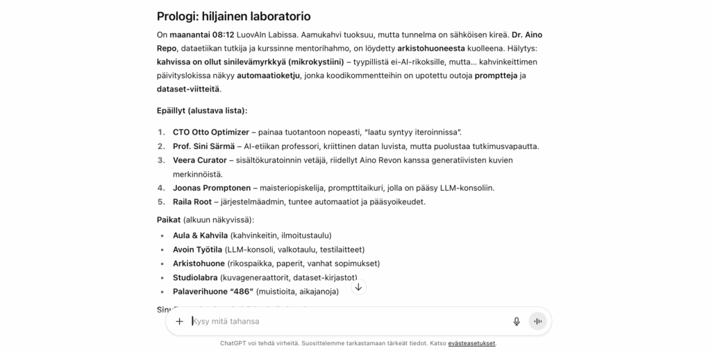 Kielimalleja voi käyttää myös tekstipohjaisten pelien luomiseen ja pelaamiseen ilman varsinaista ohjelmointia. Tekstipohjainen kielimalli kykenee toimimaan interaktiivisena tekstiseikkailupelinä. Voit määritellä pelin tavoitteet ja aiheet hyvin vapaasti, ja kielimalli voi toimia sekä pelimaailman että sen hahmojen simuloijana. Kielimalliin pohjautuvat tekstiseikkailupelit voivat olla käyttökelpoisia esimerkiksi oppimissisältöjen nopeassa rakentamisessa tai luovassa tarinankerronnassa. Kielimallin avulla voi seikkailla vaikkapa historian keskeisimmissä käännekohdissa, opetella matematiikkaa muinaisessa Egyptissä tai harjoitella murhamysteerin ratkaisemista Photoshopin käyttötaitojen avulla.